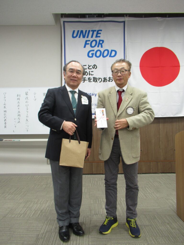 11/2の例会は、ロータリーの友地区代表委員 池森 由幸様(名古屋千種RC)にお越しいただき、「最近のロータリーの友について、利用方法と活用方法について」というテーマでお話いただきました。卓話により雑誌ロータリーの友に親しみが増しました。その他、2025年6月のカルガリー国際大会、地区やRIの裏話など聞かせていただきました。