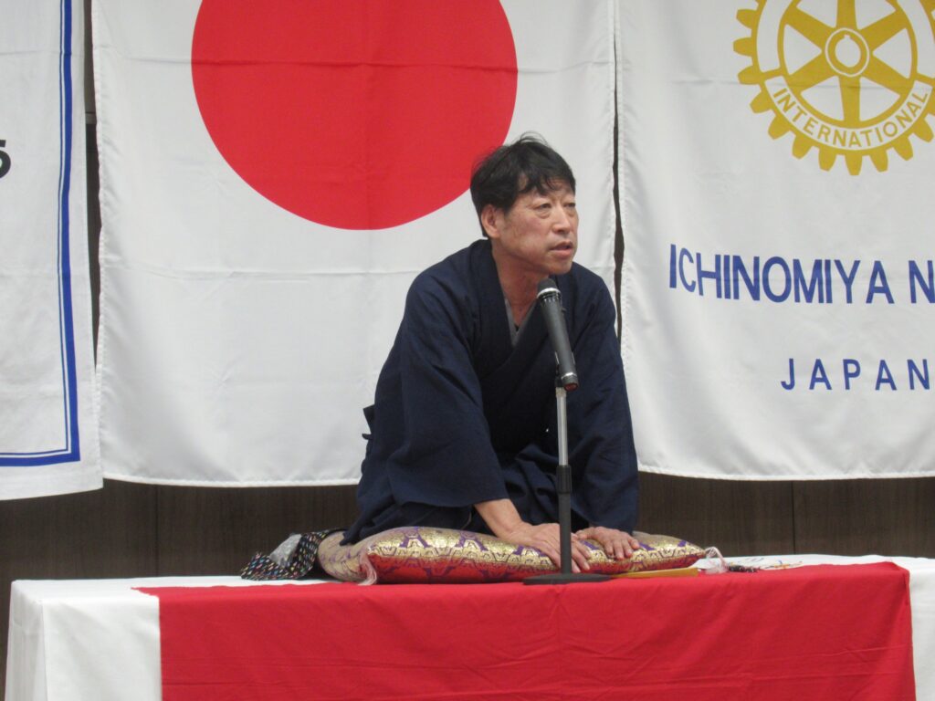 1月23日の例会には地元本格的素人落語家「引木亭あまた」様にお越しいただきました。落語の基本をご伝授くださり、その後一席聞かせていただきました。